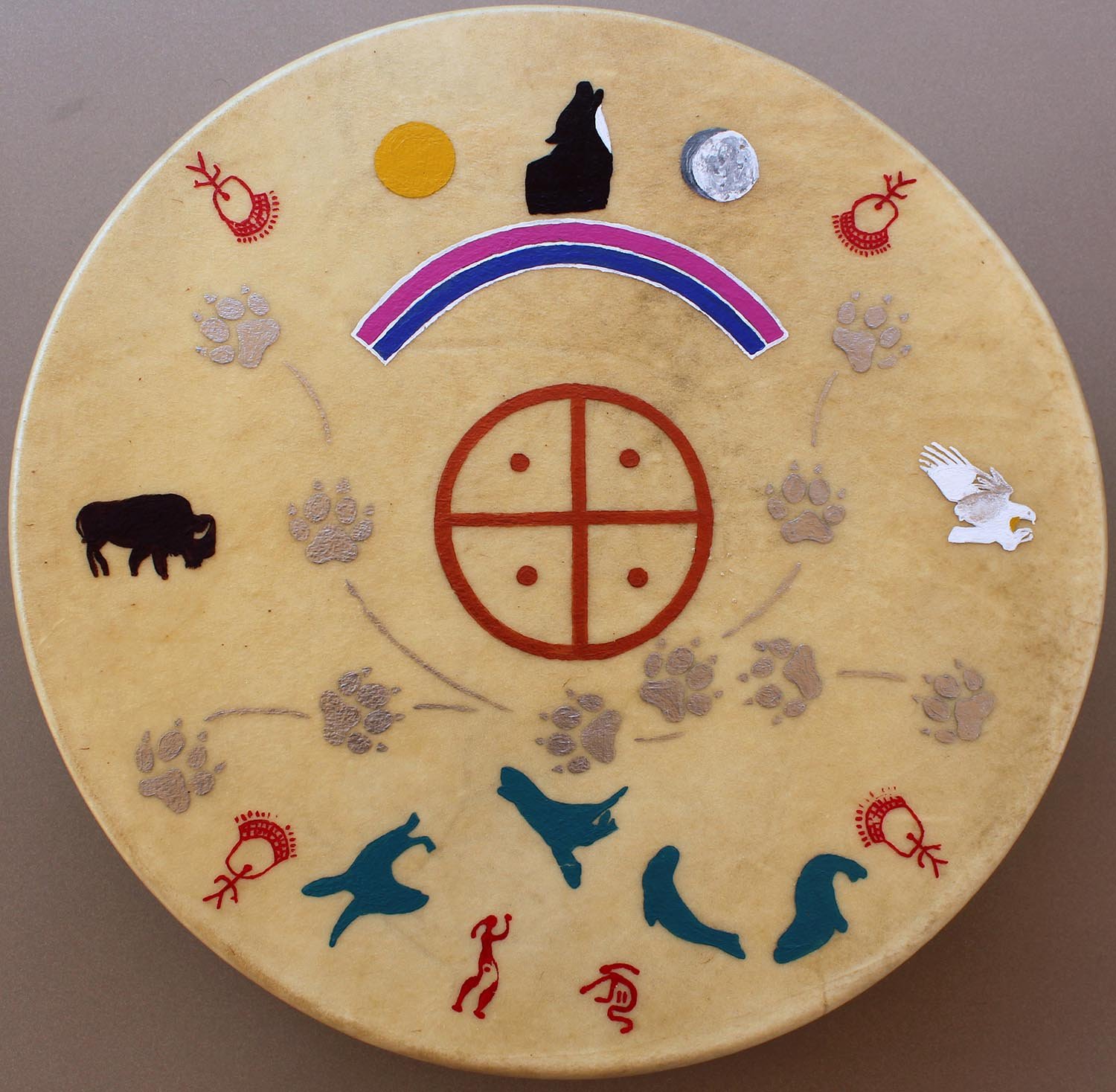 Le Règne Animal et le Règne Végétal y sont présents, ainsi que l’homme, qui assemble le cercle de bois et la peau.