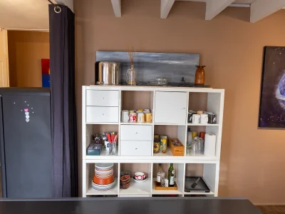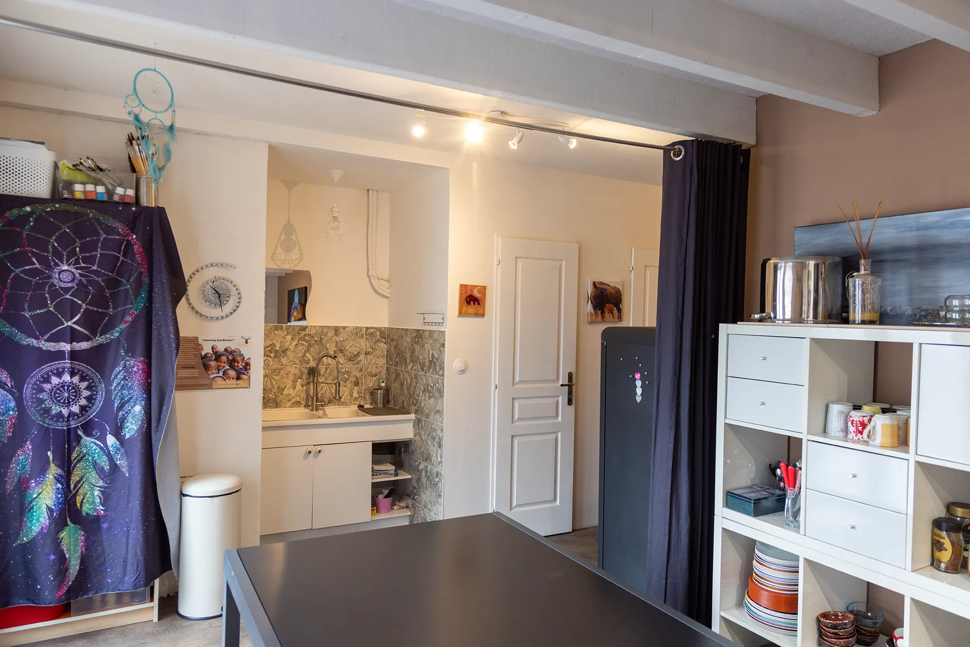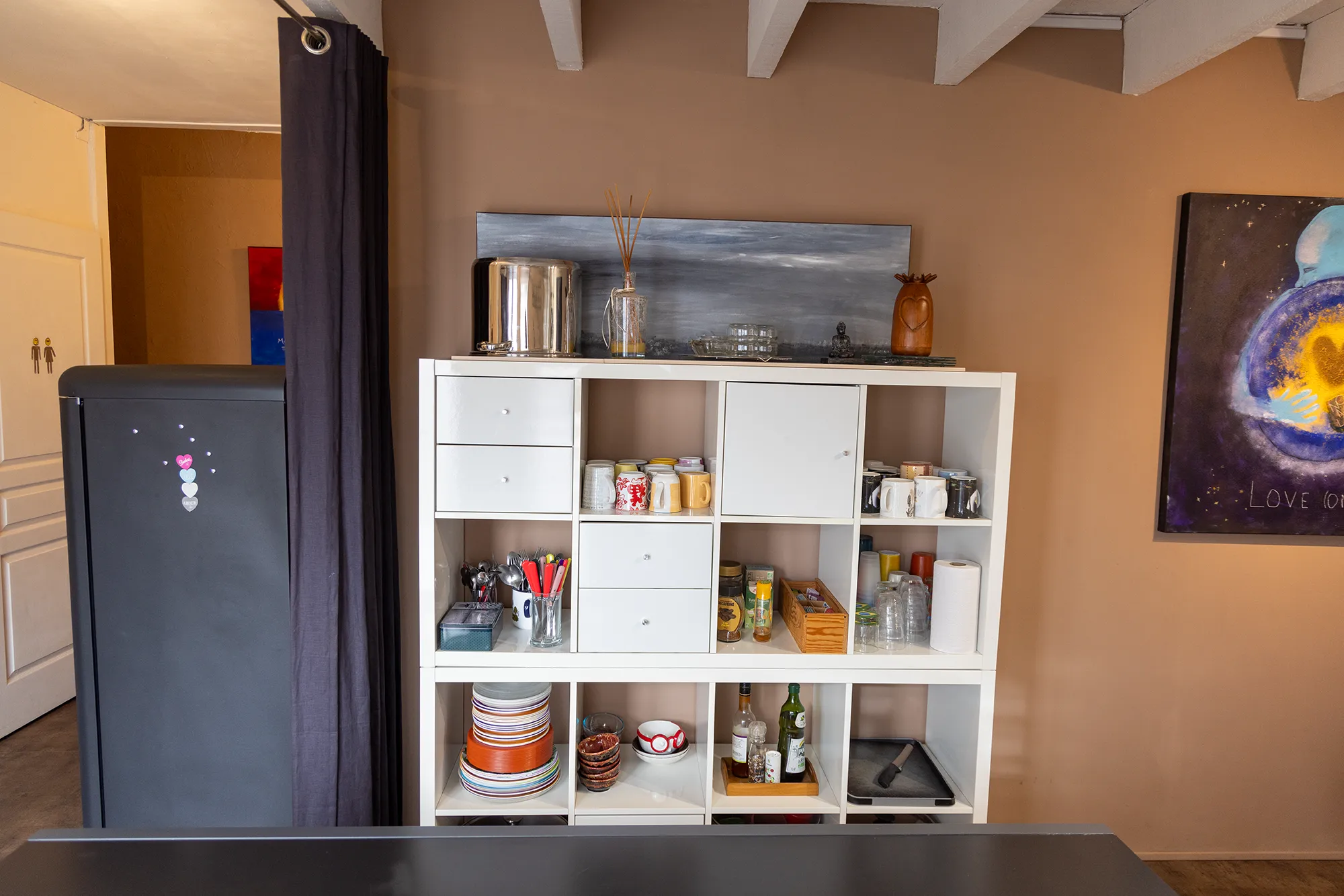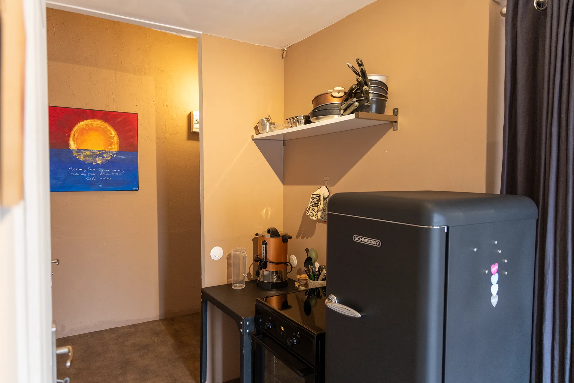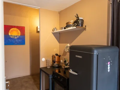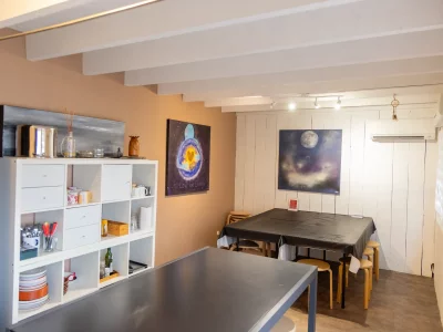Donnant directement sur le parking, un espace pauses et repas vous attend avec de l’eau chaude à volonté ainsi que des infusions et du café, un réfrigérateur/congélateur, une plaque de cuisson à induction, un four traditionnel (attention : pas de micro-ondes) ainsi que toute la vaisselle nécessaire à la préparation et la dégustation de votre repas.